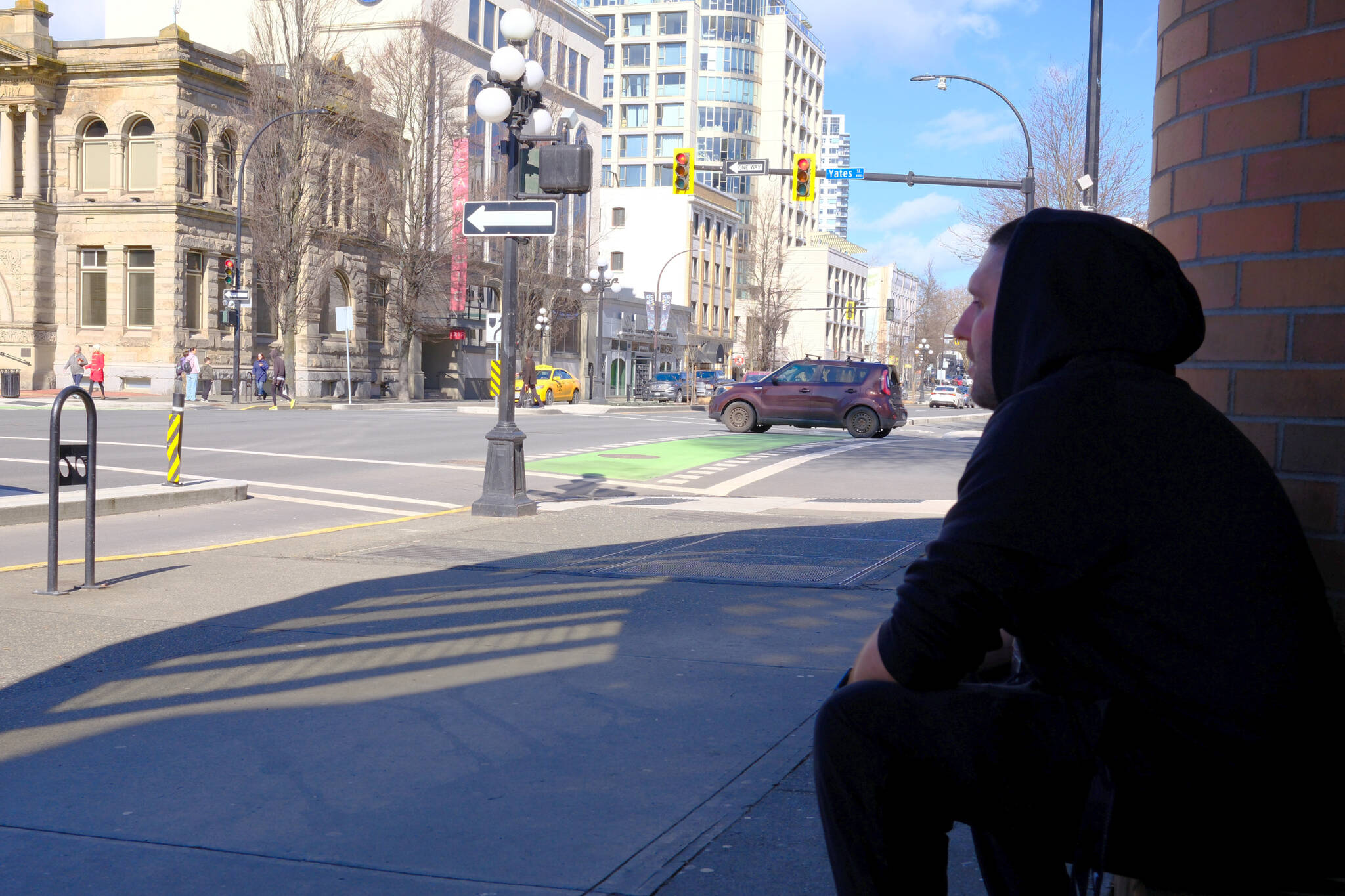 Cory Hage sits at the corner of Yates and Blanshard streets, where he hung out with friends in his teenage years, frequenting spots like the now-closed arcade Johnny Zee’s. (Olivier Laurin/Victoria News)