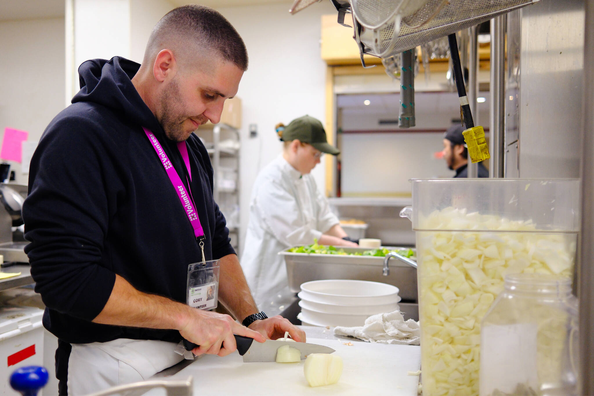 Cory Hage stands with his back slightly curved, a sharp chef’s knife in hand. His eyes are fixed on one thing: cutting onions. With steady strokes, he slowly fills an eight-quart container with large dice. This marks his first day volunteering at Our Place Society’s kitchen, helping staff prepare Salisbury steak for lunch later in the week.