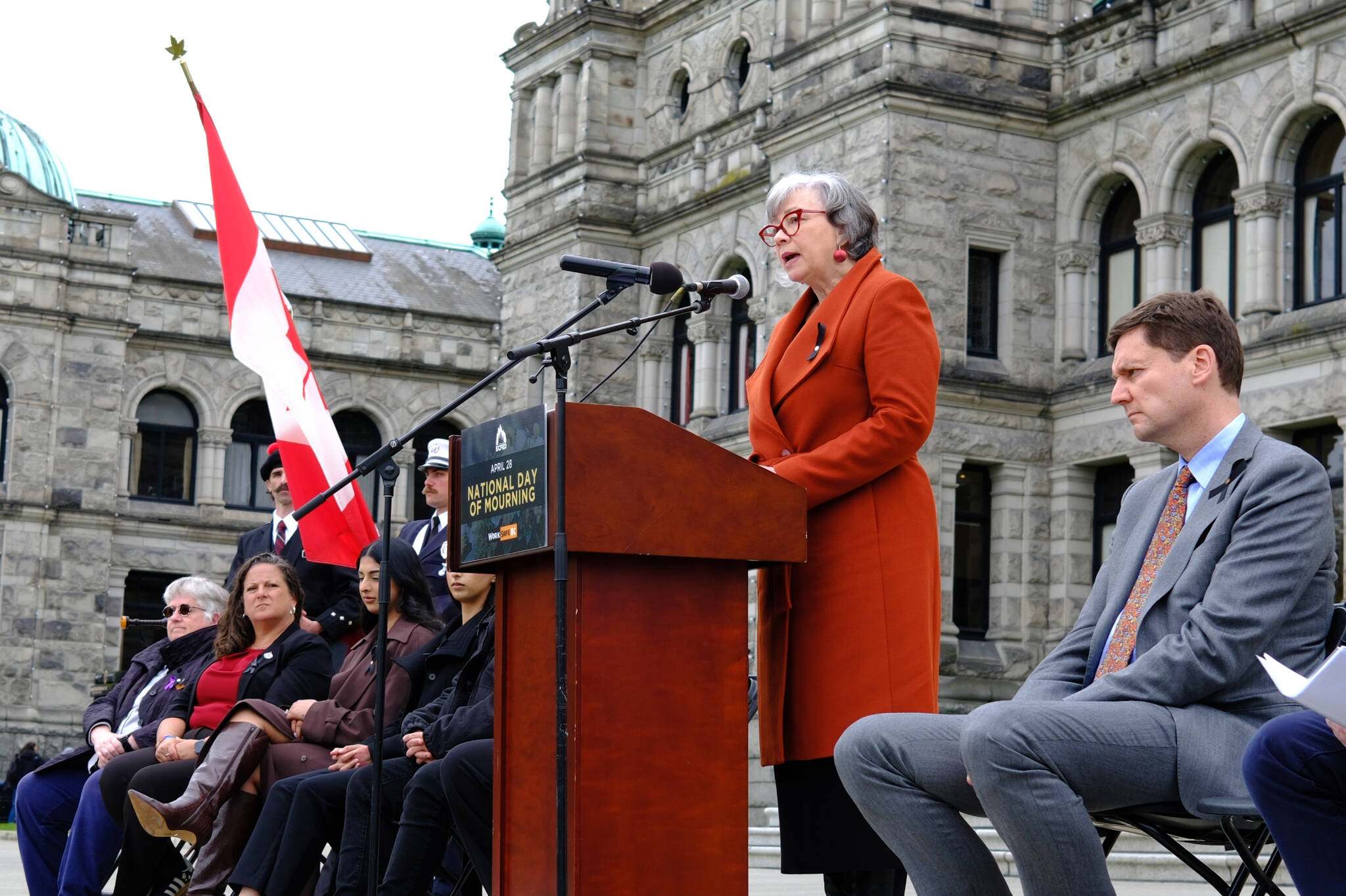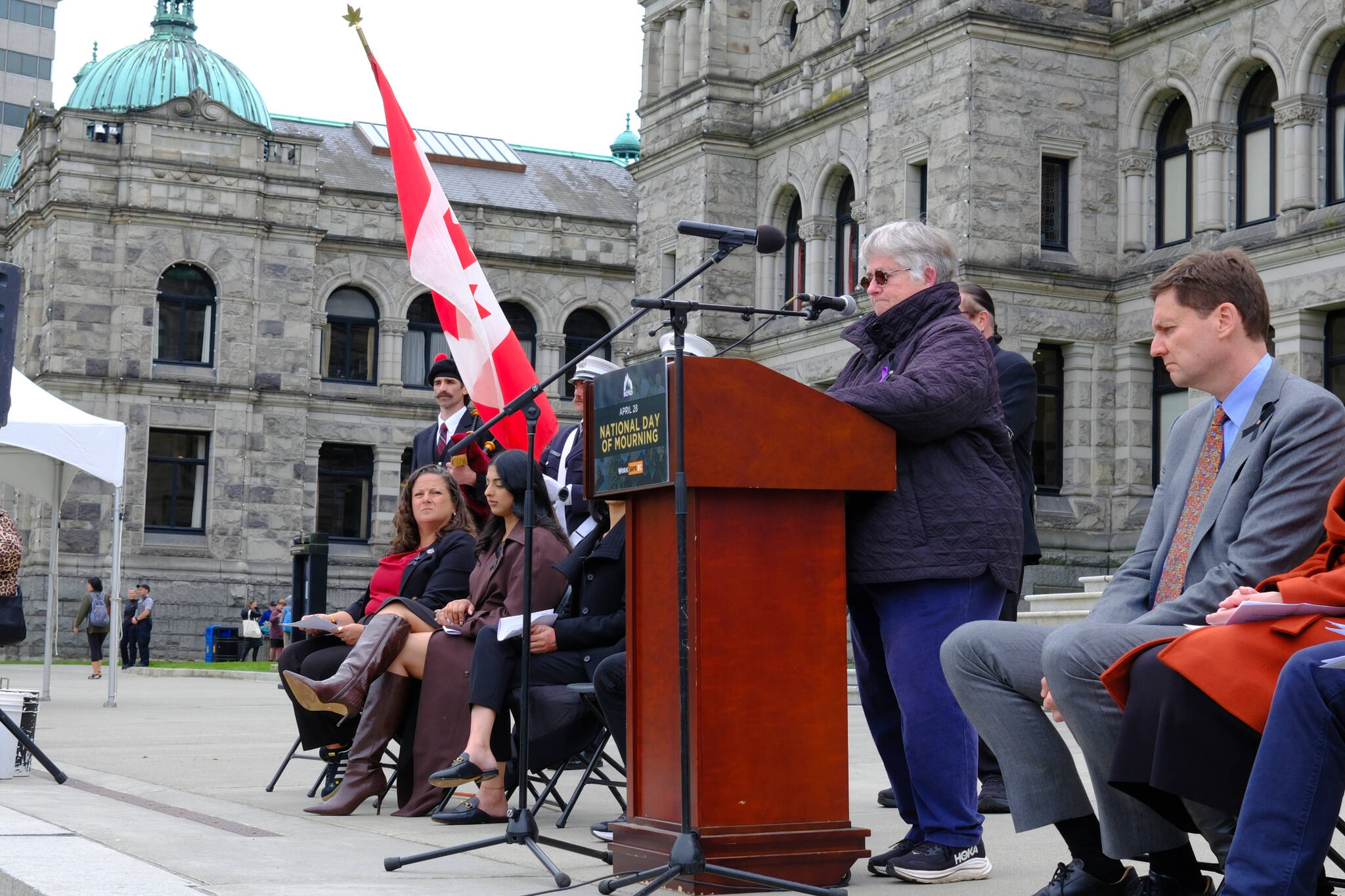 Victoria Mayor Marianne Alto addresses the crowd at the 2026 National Day of Mourning ceremony in Victoria on April 28. (Olivier Laurin/Victoria News)